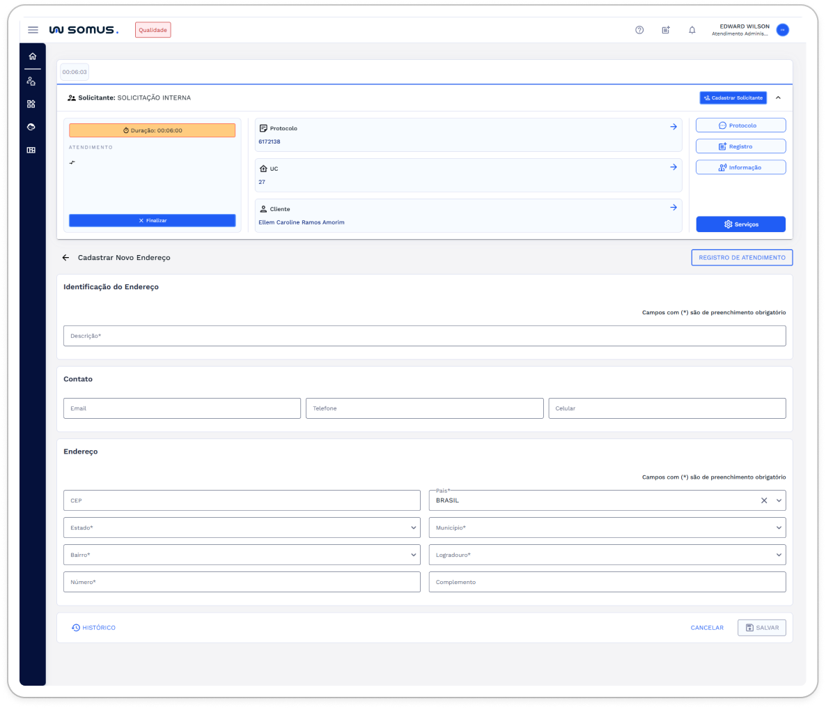 Novo Endereço: O botão Novo Endereço permite incluir um novo endereço vinculado ao cliente em atendimento. Ao ser acionado, exibe o formulário para preenchimento dos dados do endereço.