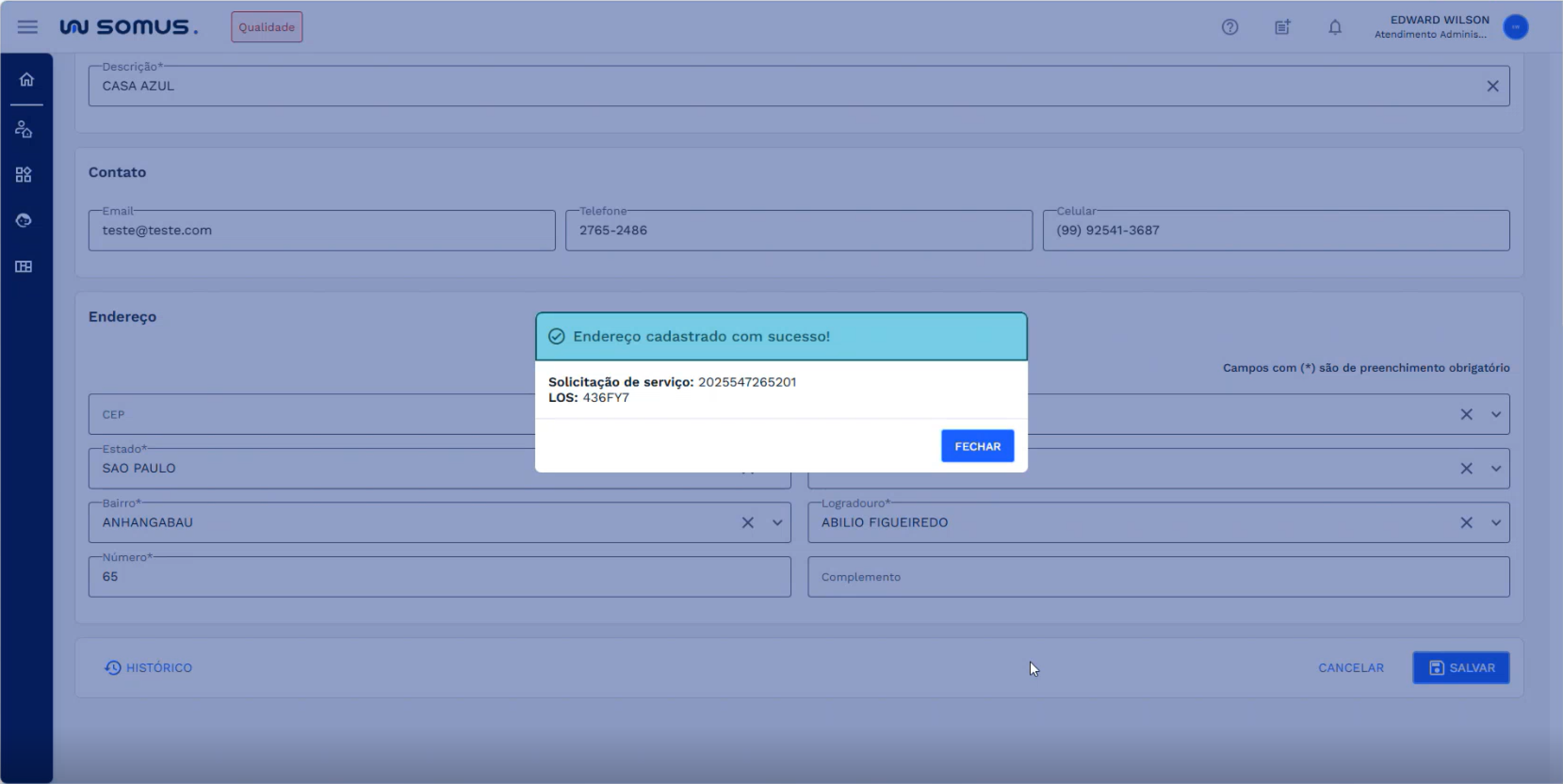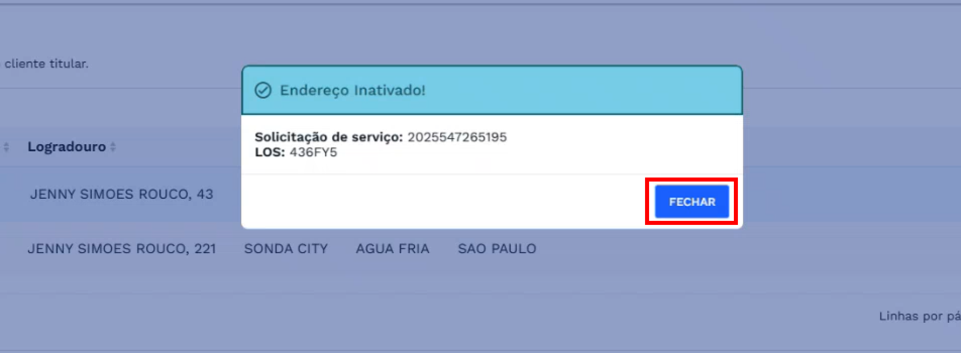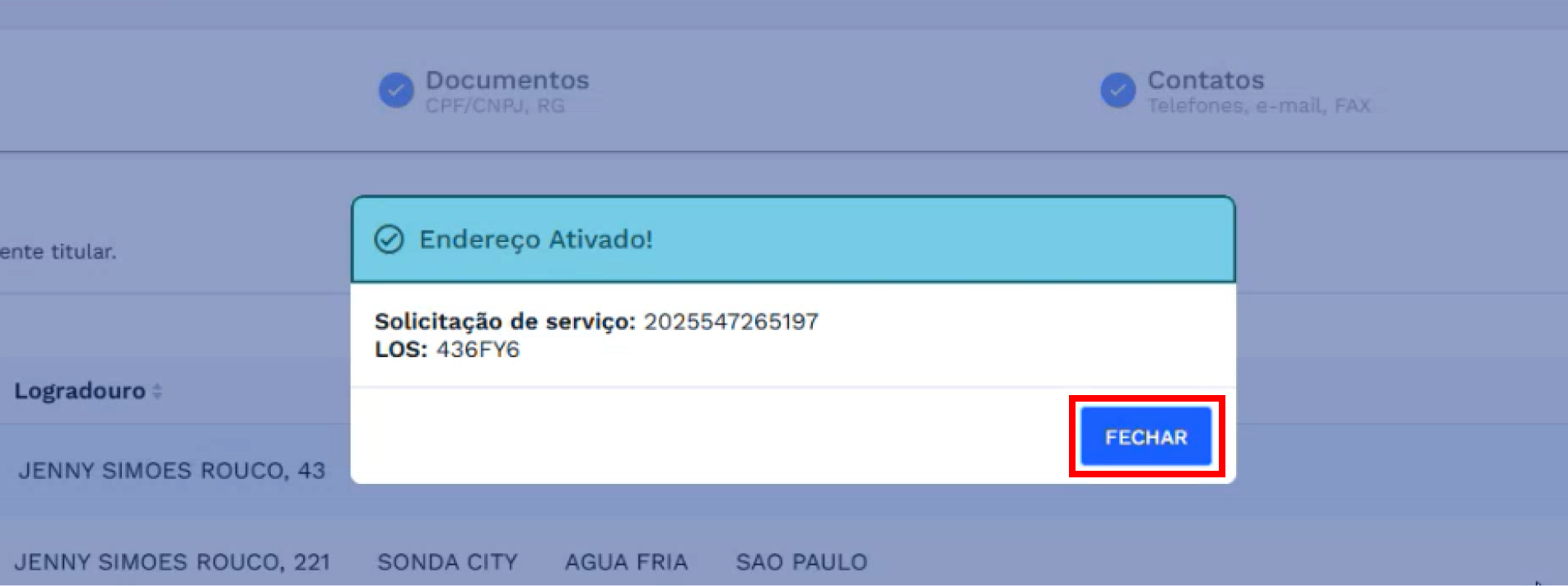 Após clicar em ativar, o sistema realizará todas as validações necessárias. Caso não haja nenhum impedimento para que a ativação seja realizada, a situação do endereço será alterada e uma caixa de diálogo de sucesso, contendo o número da solicitação de serviço e LOS, será exibida.