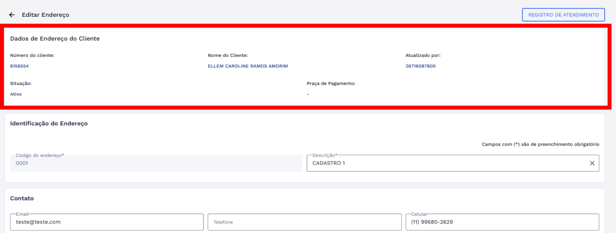 O sistema exibirá a tela de edição do endereço. Nessa visão, será apresentado um card de dados do endereço do cliente com os dados resumidos do endereço selecionado, facilitando o reconhecimento do registro.