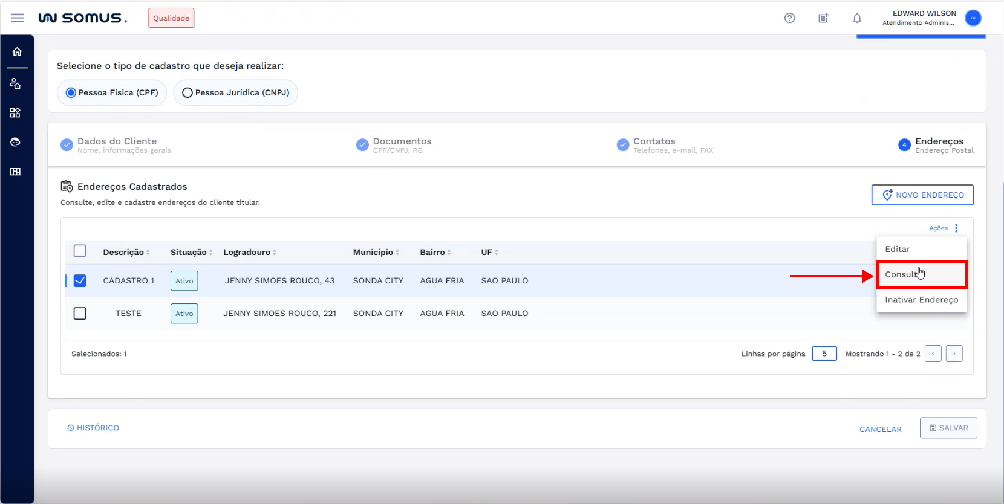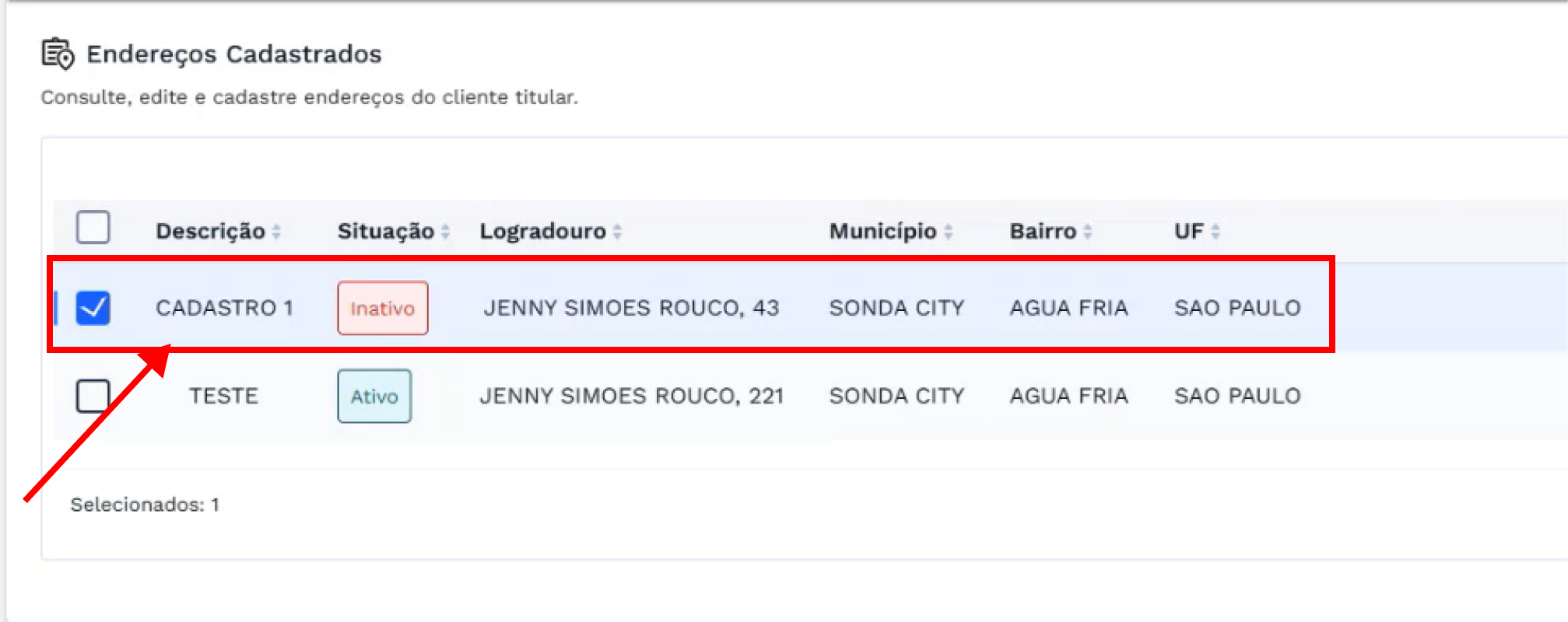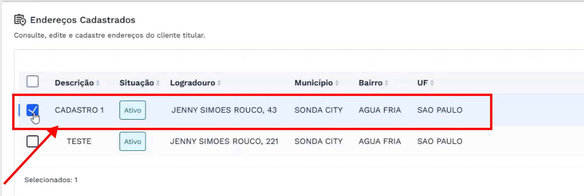 Para consultar os dados de um endereço já cadastrado, selecione uma das entradas na lista de endereços usando o checkbox localizado à esquerda da linha desejada.
