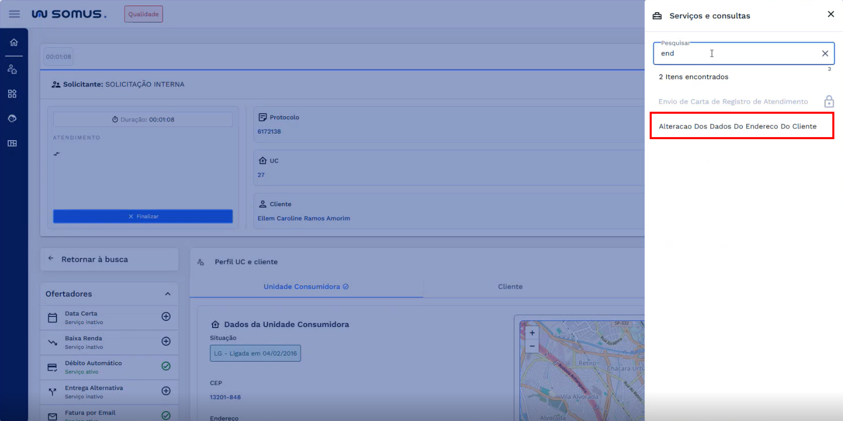 Login > Workspace de Atendimento > No menu de navegação selecione o item “Atendimento ao Consumidor” > Barra de atendimento > Iniciar atendimento > Buscar por uma UC/Cliente > Perfil UC/Cliente > Botão “Serviços e Consultas > Alteração dos Dados do Endereço do Cliente.