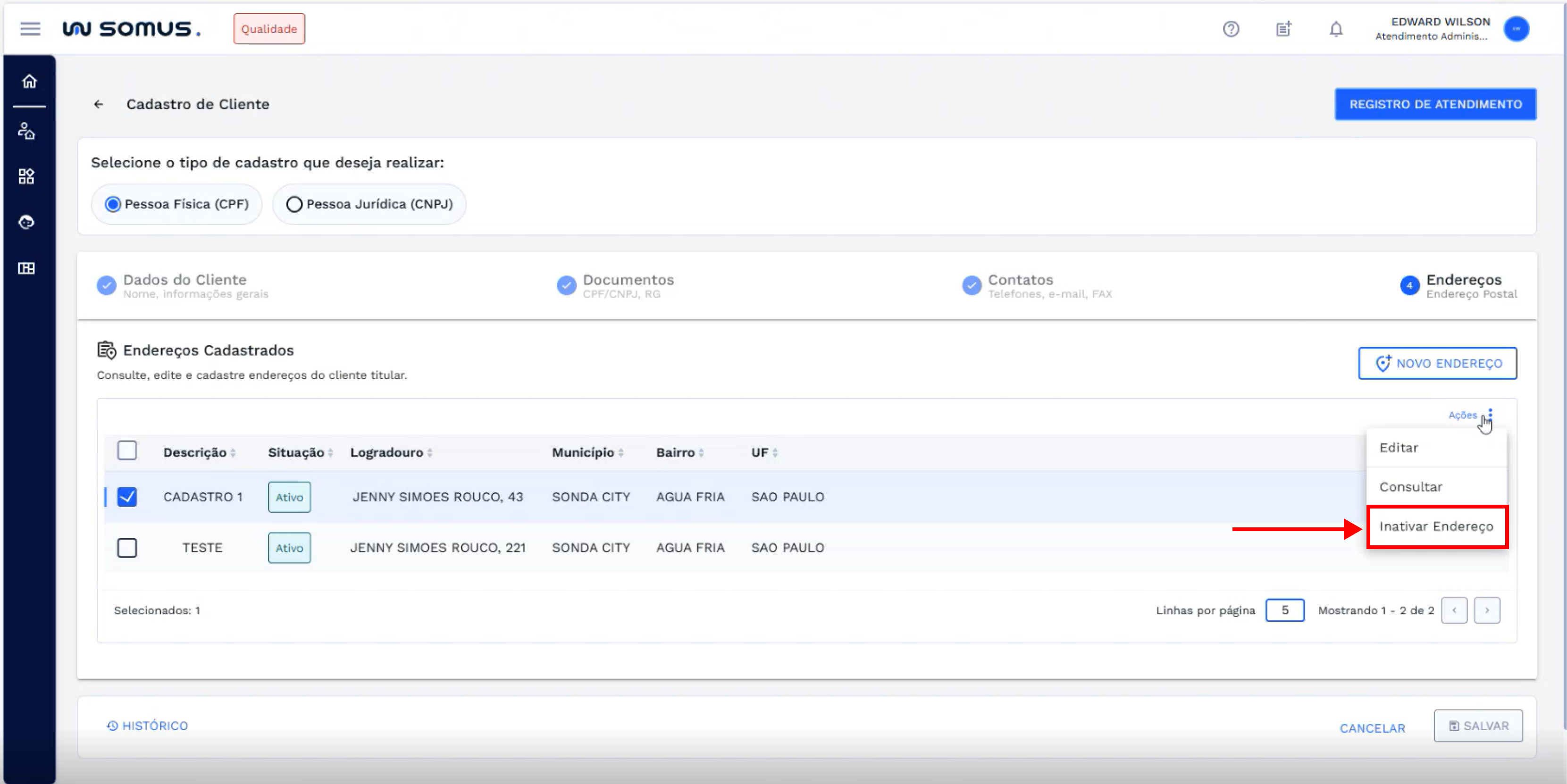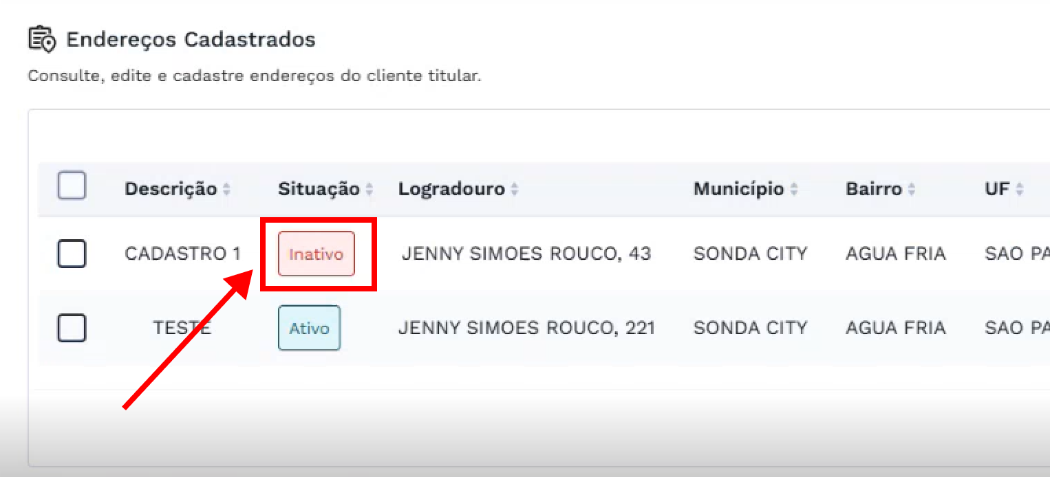 Para inativar um endereço, primeiro selecione o endereço desejado, marcando a caixa de seleção (checkbox) à esquerda da linha correspondente.