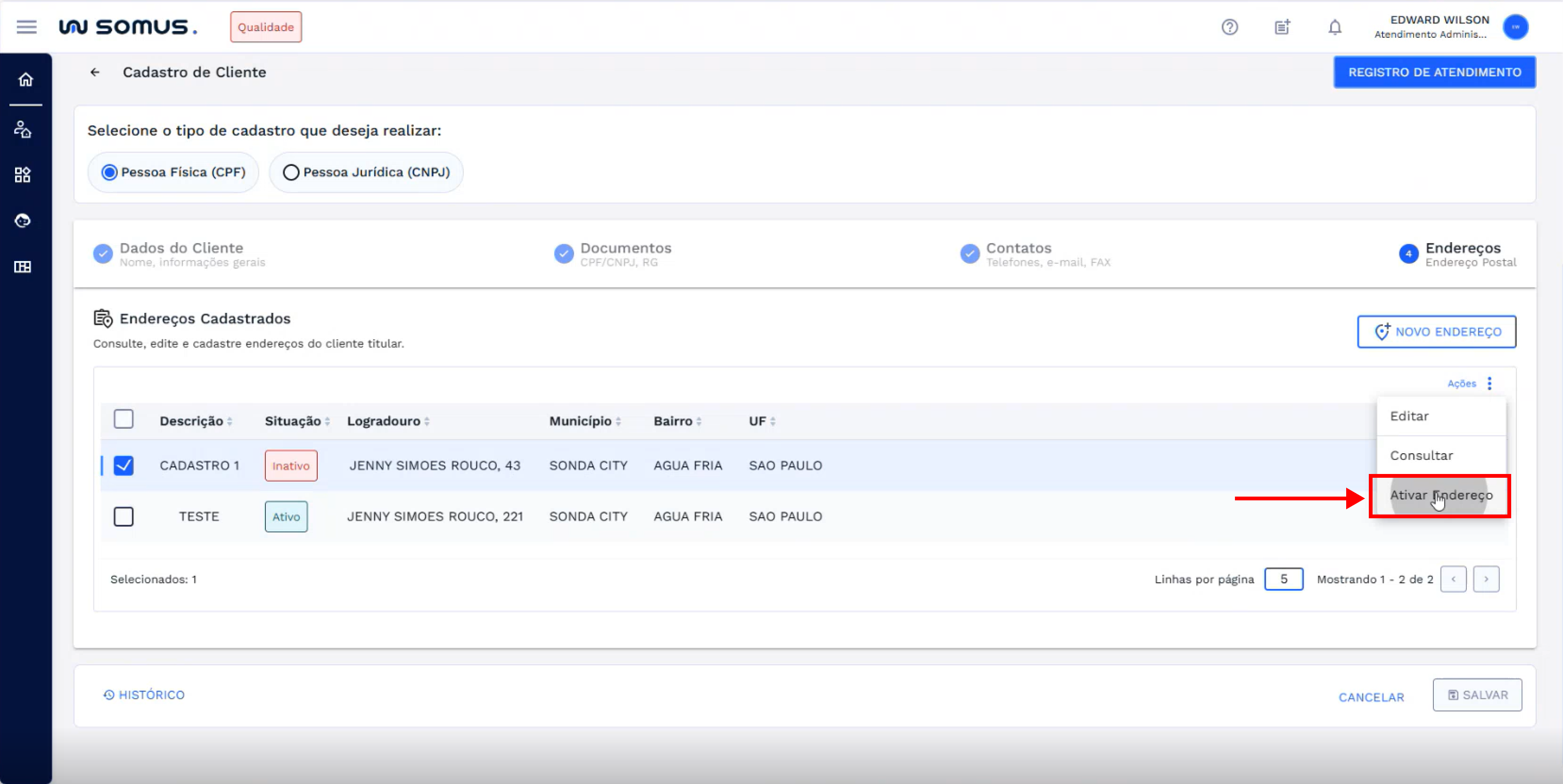 Para ativar um endereço, primeiro selecione o endereço desejado, marcando a caixa de seleção (checkbox) à esquerda da linha correspondente.