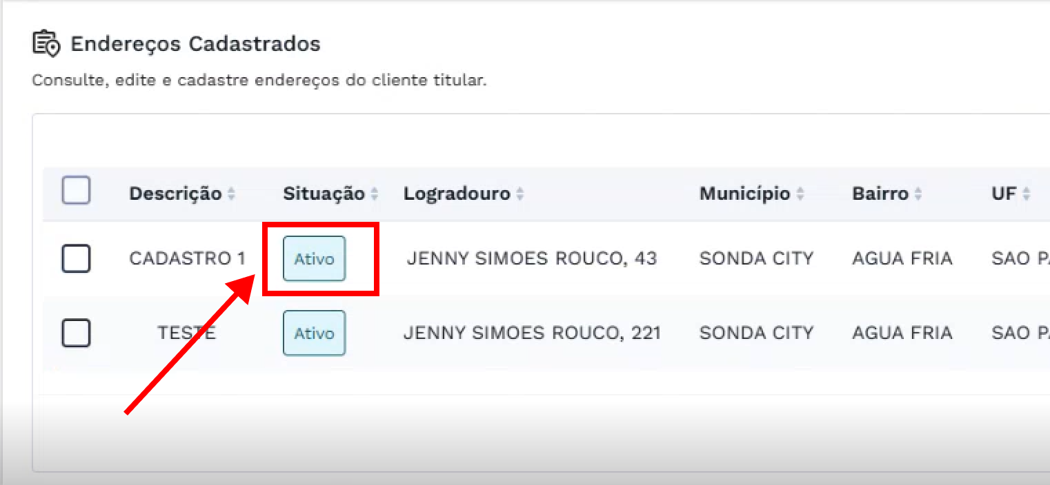 Se houver endereços cadastrados, eles serão listados com seus respectivos dados e situação.