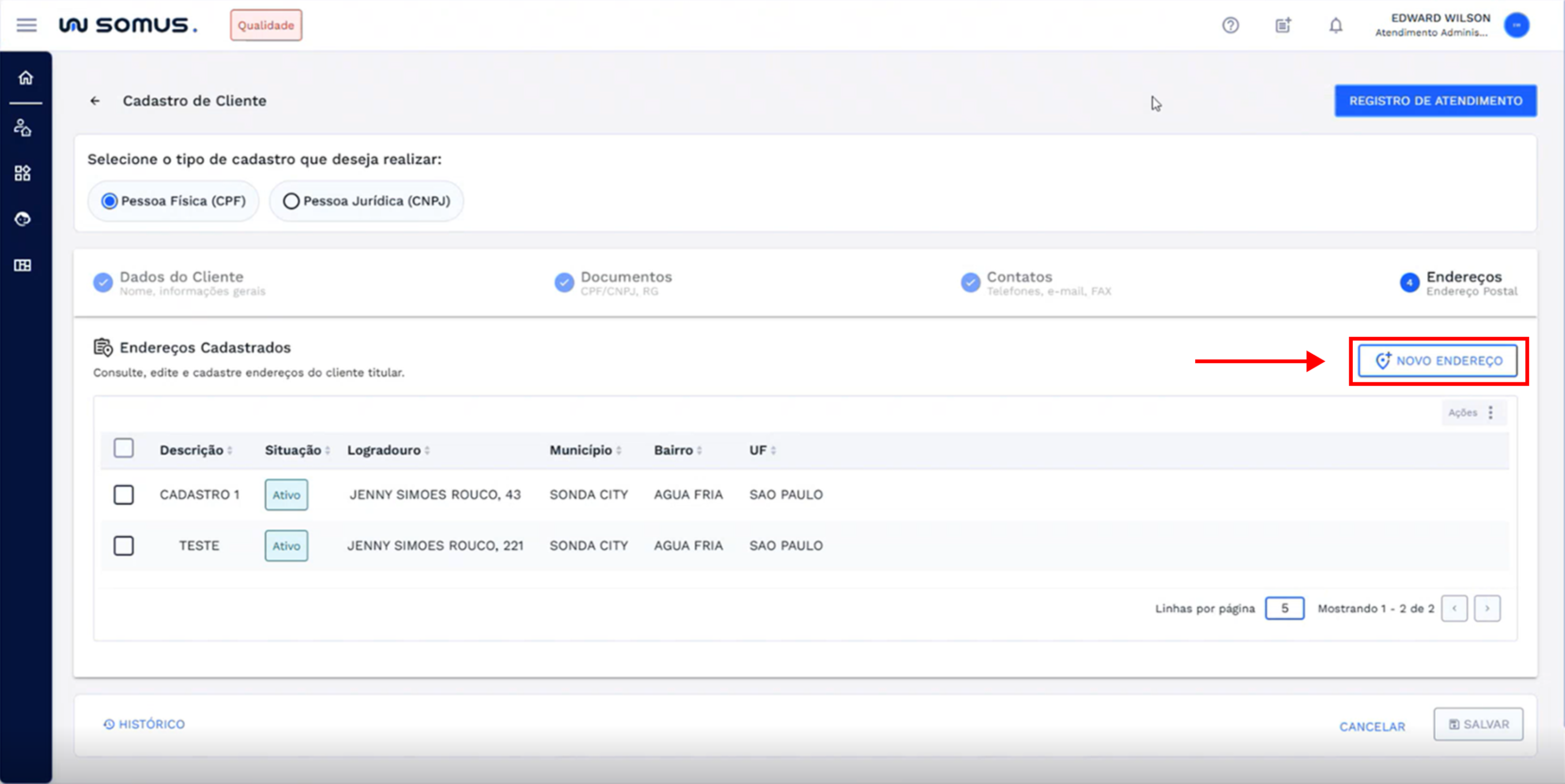 Para cadastrar um novo endereço para o cliente de atendimento, clique no botão “NOVO ENDEREÇO” do lado direito da tela.