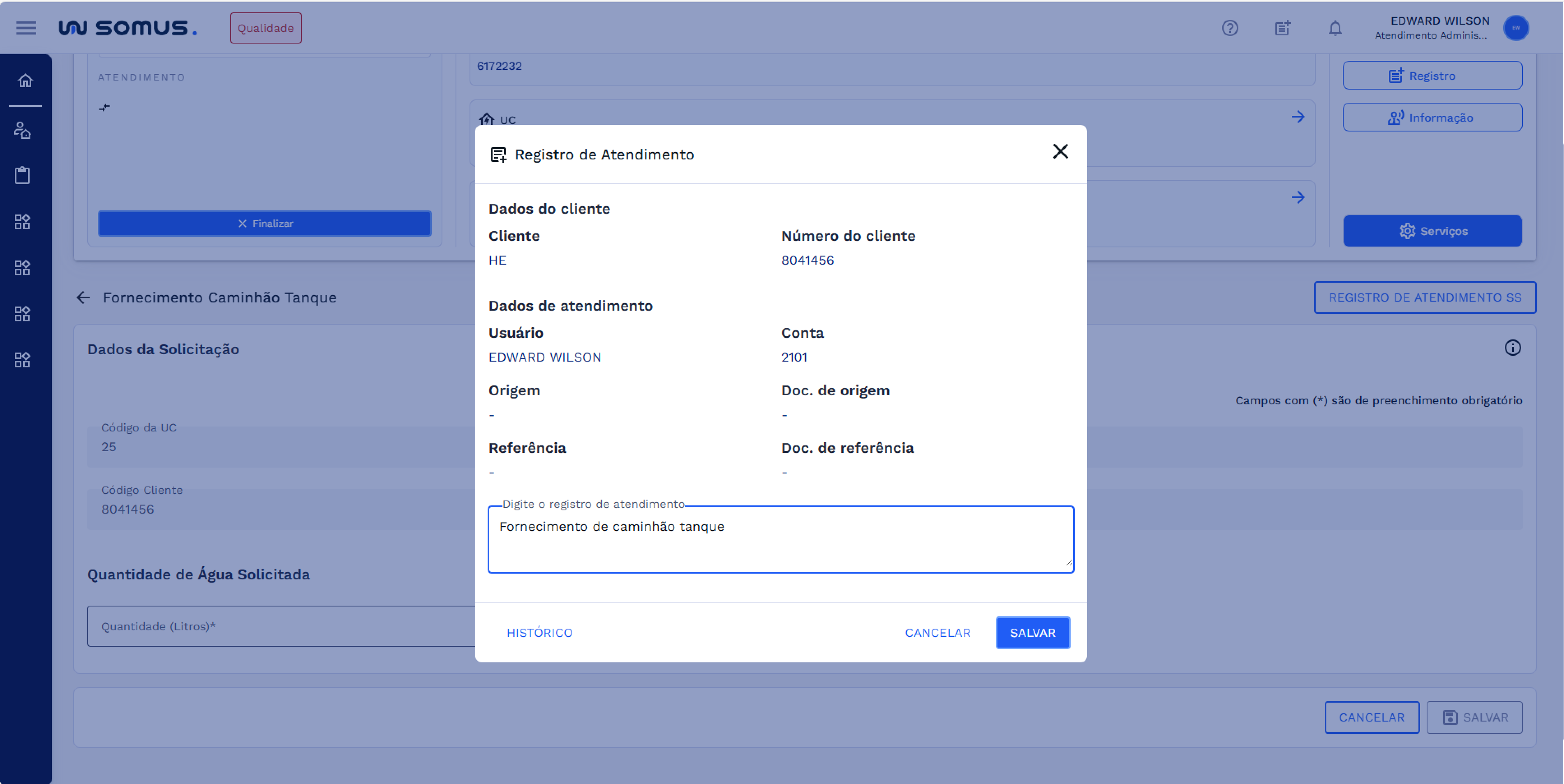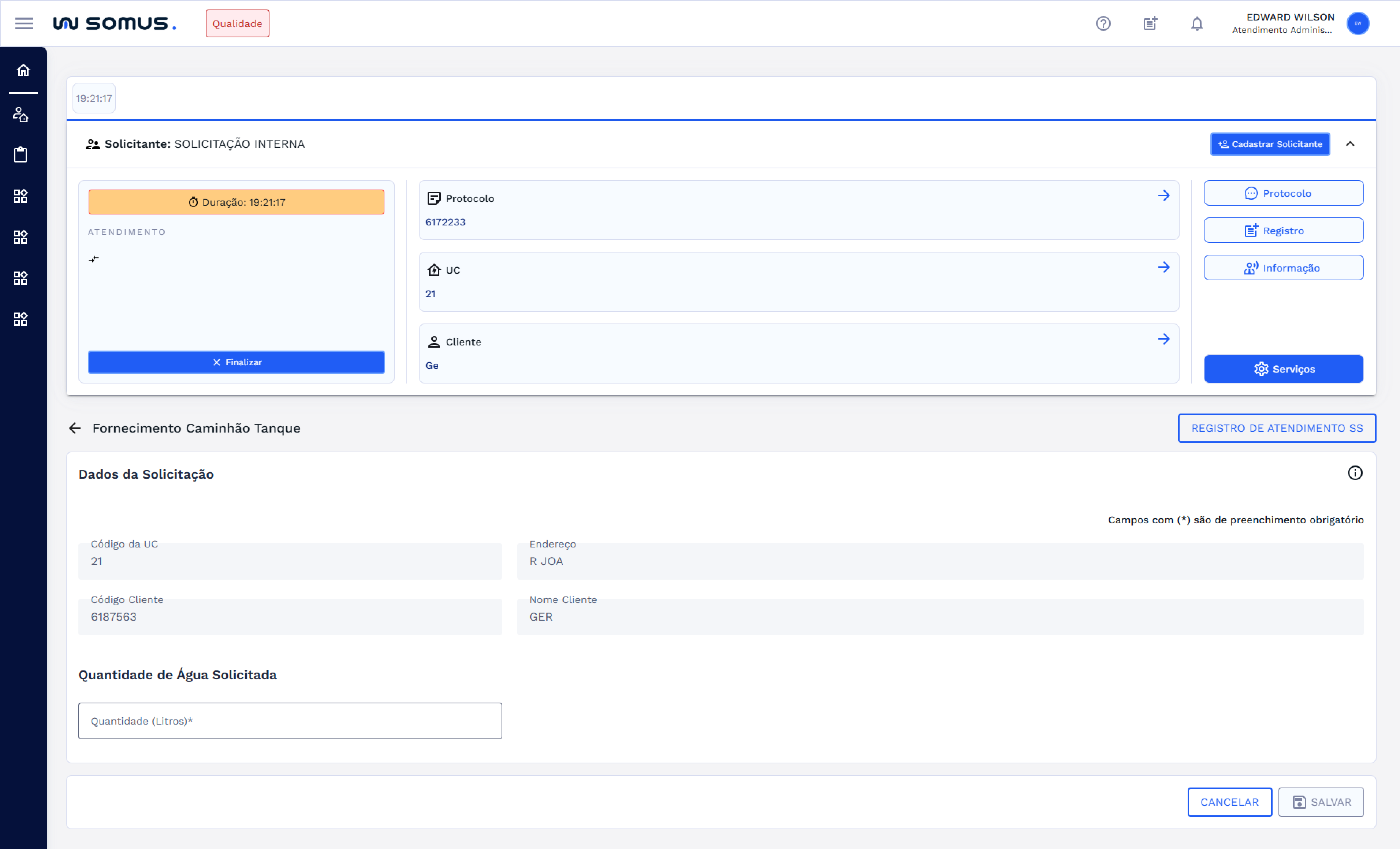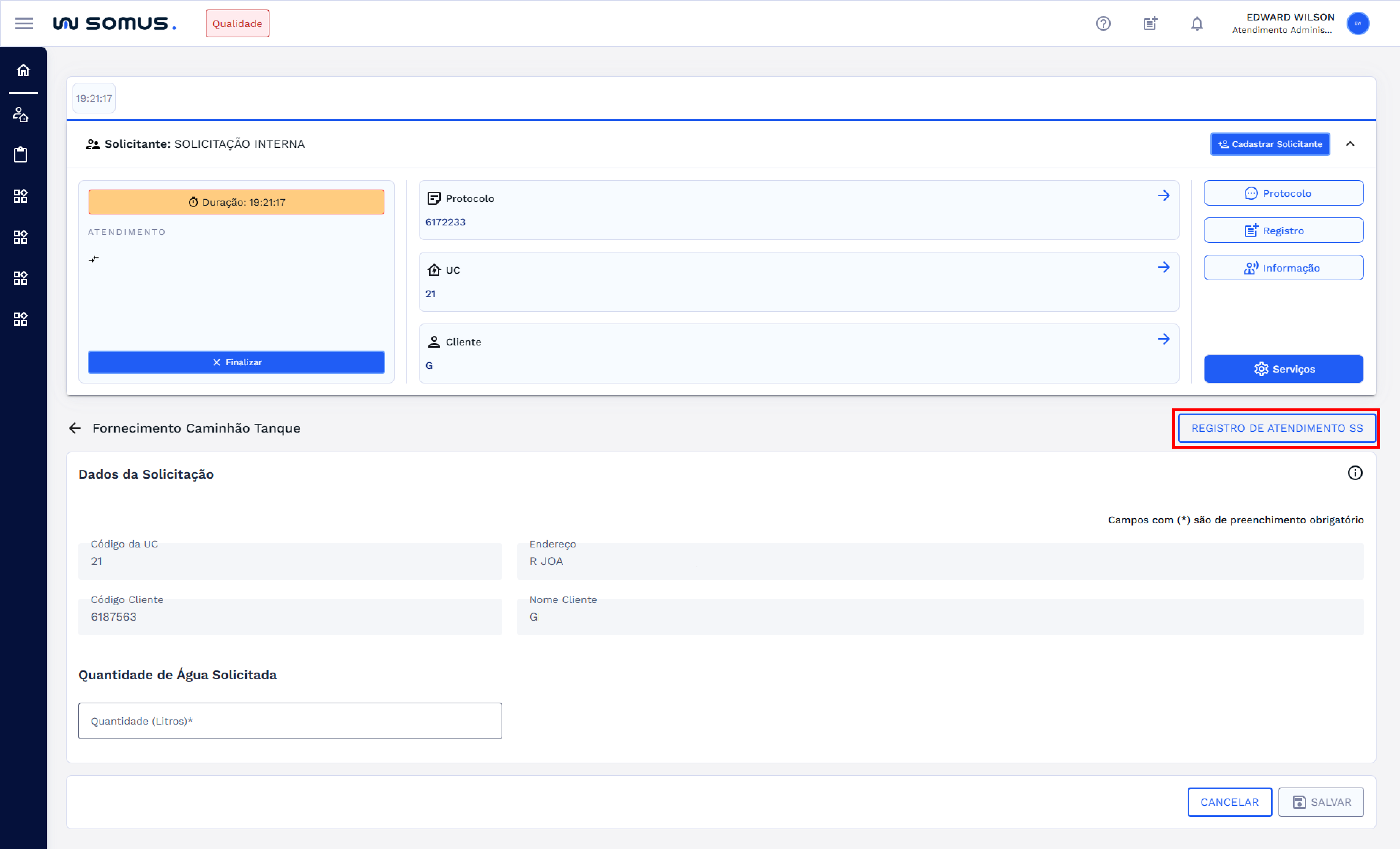 | Atendimento | Registrar OS de Fornecimento de Caminhão Tanque |