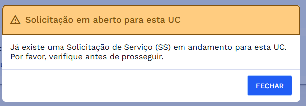 Ao tentar registrar uma nova solicitação de fornecimento de caminhão tanque para uma Unidade Consumidora (UC), caso já exista uma solicitação em andamento para essa mesma UC, o sistema impedirá a criação da nova solicitação e exibirá o seguinte alerta: