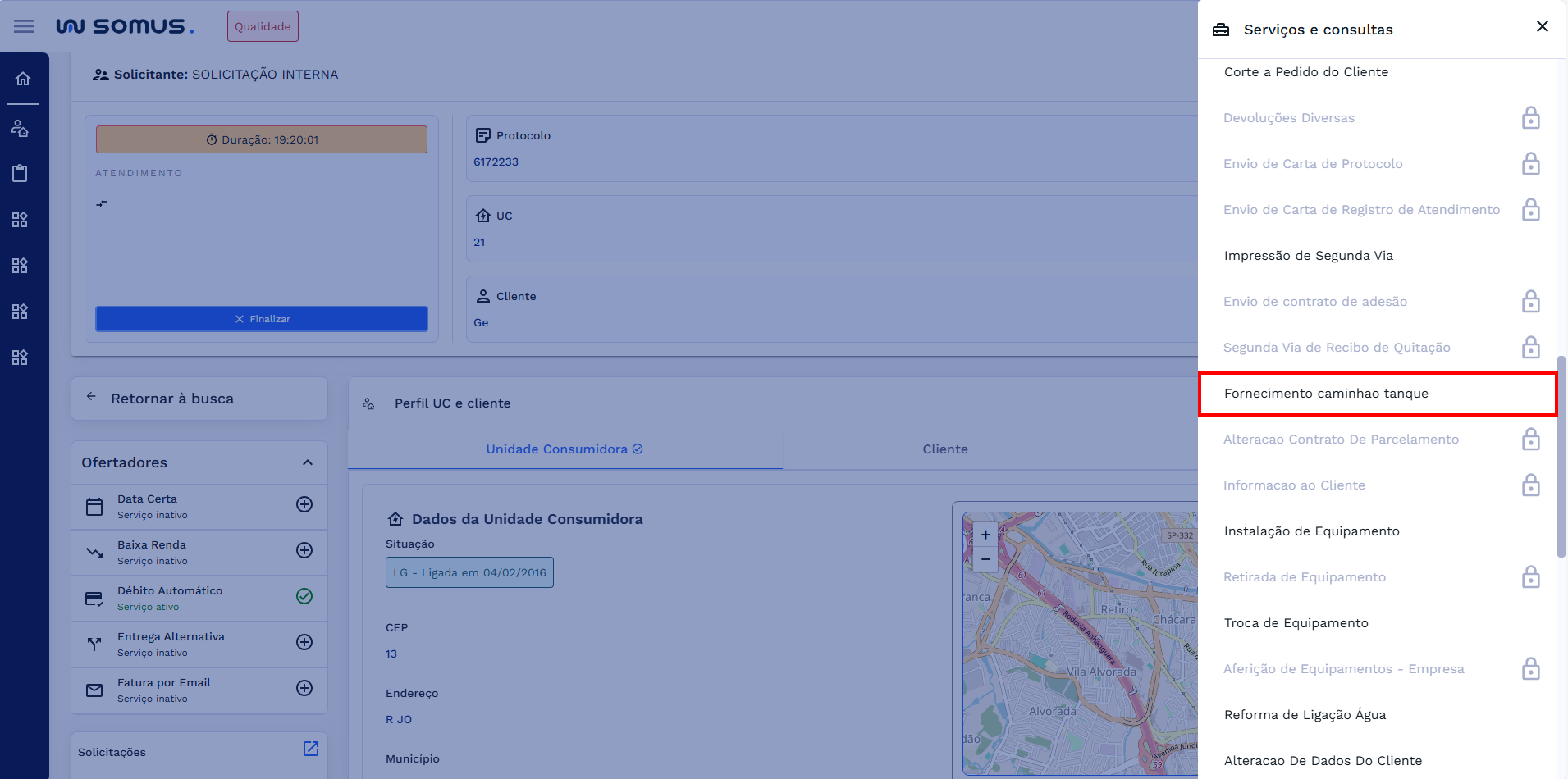 Acesse o Workspace de Atendimento e, antes de iniciar qualquer busca, selecione uma das opções de senha disponíveis: Chamar Senha, Senha Avulsa, Senhas Agendadas ou Sem Senha. Somente após essa etapa a busca será habilitada. Em seguida, utilize a busca para localizar a UC ou o cliente desejado. Após selecionar o resultado, acesse o Perfil UC/Cliente e clique no botão Serviços para abrir o menu lateral. No menu exibido, selecione o item Fornecimento Caminhão Tanque para abrir a aplicação.