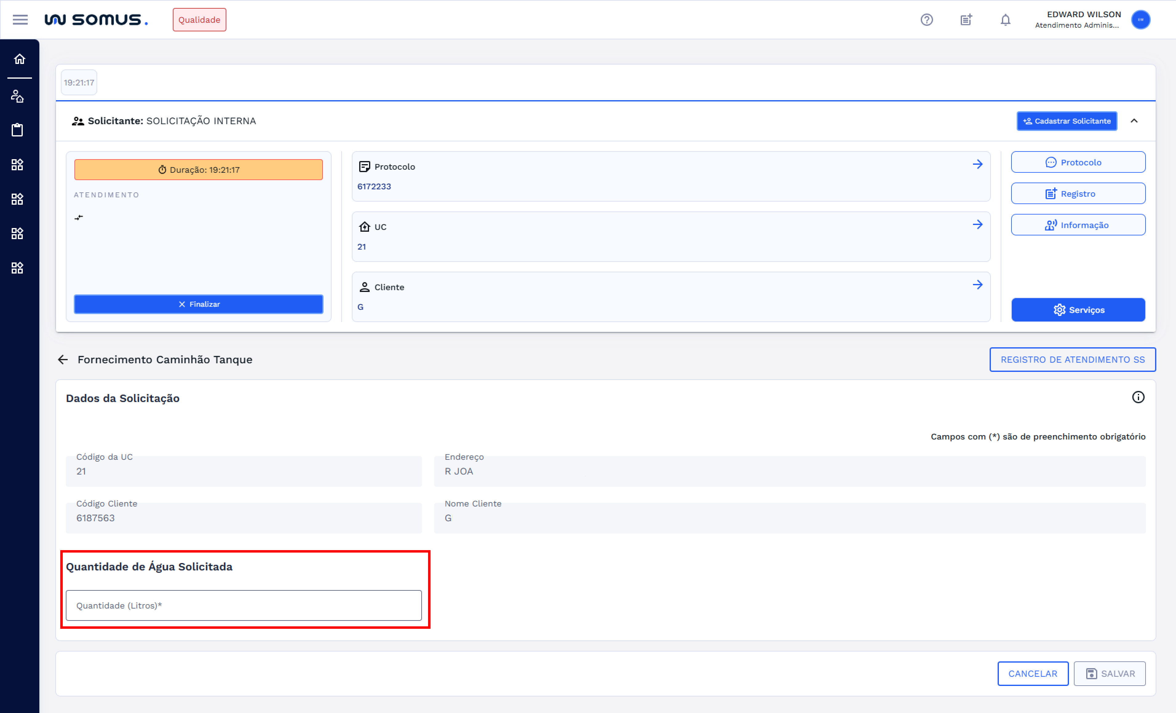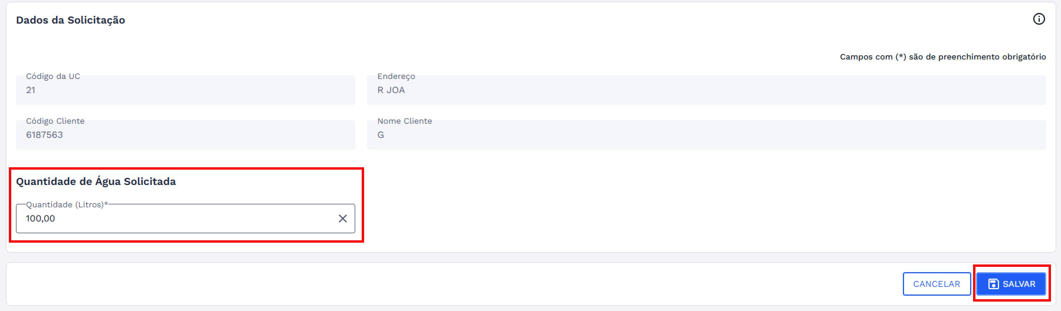 Ao ser direcionado para a aplicação será exibido um formulário com os dados da solicitação, preenchidos automaticamente pelo sistema de forma consultiva. Dentre as informações apresentadas, estão o código da UC, endereço, código do cliente e nome do cliente. Abaixo desses dados, há um campo destinado ao preenchimento da quantidade de água solicitada pelo cliente, informada em litros.