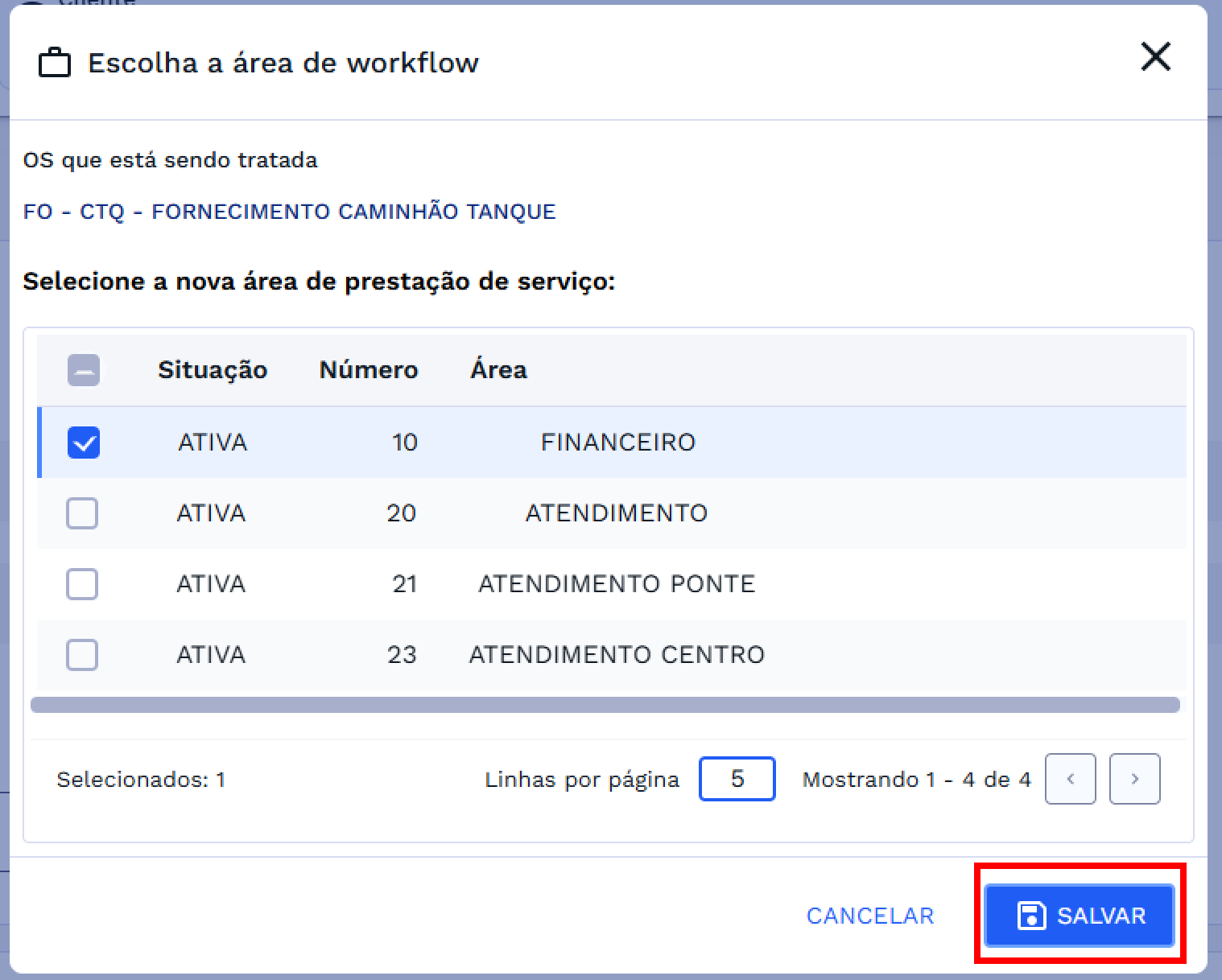 Após clicar em SALVAR, o sistema apresentará uma nova janela intitulada Área de Workflow. Nessa etapa, será exibida a área de prestação de serviço já cadastrada para a OS que está sendo tratada. Caso existam múltiplas áreas disponíveis, selecione a nova área desejada marcando a respectiva caixa de seleção na lista.