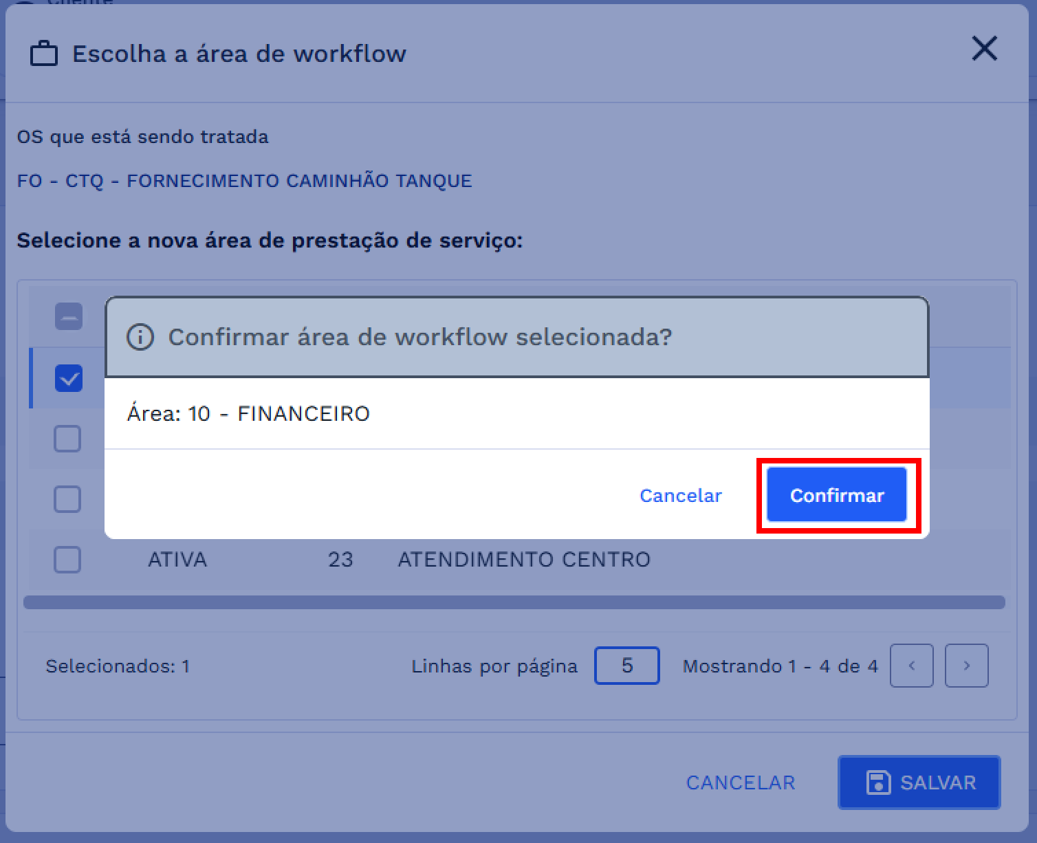 Ao clicar em SALVAR o sistema apresentará uma caixa de diálogo para confirmar a seleção da nova área de workflow. Para prosseguir, clique em CONFIRMAR e caso deseje retornar clique em CANCELAR. Confira na imagem abaixo: