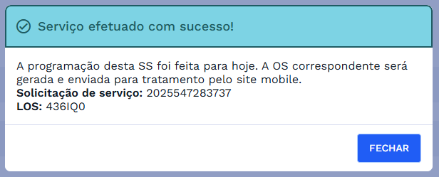 Ao confirmar, o sistema realizará todas as validações necessárias e, estando tudo de acordo, será exibida uma caixa de diálogo indicando que o serviço foi efetuado com sucesso e exibindo informações como a data da programação da OS e o número da solicitação de serviço, conforme o exemplo abaixo: