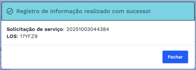 Ao clicar em “Confirmar” o sistema dará um aviso de sucesso e informará o número da Solicitação de Serviço e o número de LOS gerados.